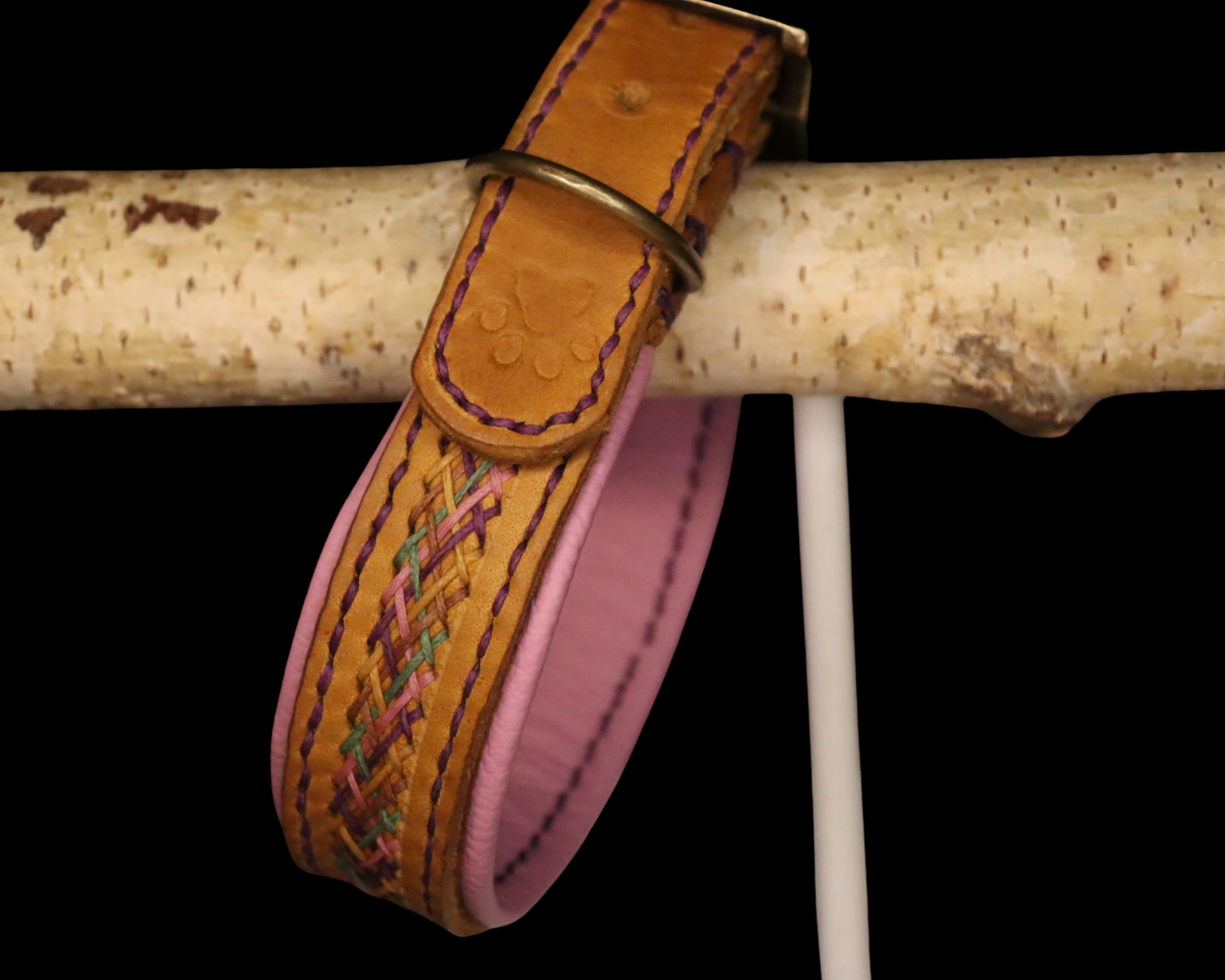 Deze mooie halsband is met de hand vervaardigd uit hoogwaardig vetleer, met een mooie uitstraling door het speciale weefwerk van waxdraad.