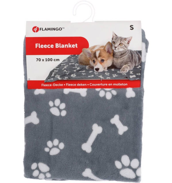 Deze mooie zachte flanel fleecedeken van Flamingo in donkerblauw met hondenpootjes en botjes is ideaal voor op de bank, de auto of in/over de bench.